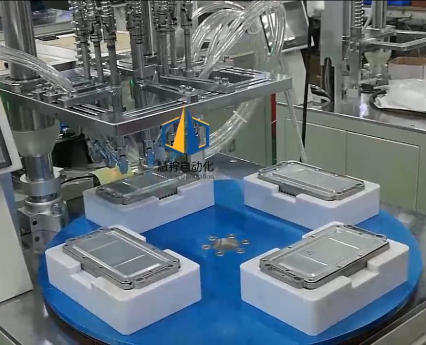 10軸轉臺式自動擰螺絲設備,可一次同時擰好10顆螺絲,生產效率極高,配置轉臺,設計專用4工位治具,可在設備擰螺絲的同時,員工取放產品,實現同步作業節省時間。下圖為實際案例圖。